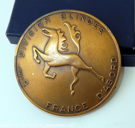Ancienne médaille 5 eme Division Blindée France D’Abord - Médaille de table en bronze, représente un cheval fougueux - sale a nettoyer - a signaler un léger coup sur la tranche à 14h - Diamètre 60 mm poids 91 gr. Livré dans une boite étui non d’origine.