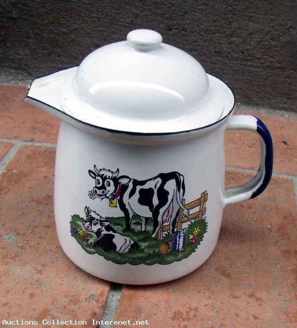 Pot a lait de table métal émaillé. Des Années 1990. Dimensions: Hauteur total 12,5 cm X diamètre 10 cm X largeur total 13,5 cm. bon état, Petit choc au dessous du col ( 2cm). Décor Vache. Référence: N180212.