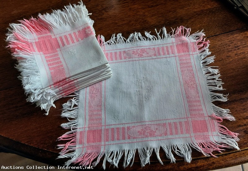 Deux séries de six serviettes en coton damassé. De couleur rose et blanc.