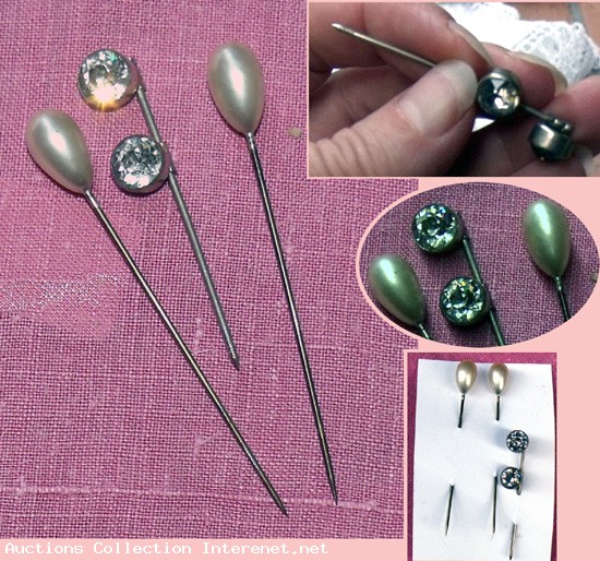 Trois Anciennes épingles à chapeau.Bijoux en métal, perle synthétique nacrés blanche et