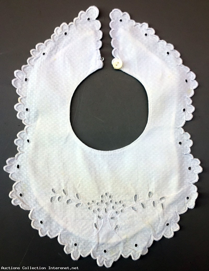 Ancien Bavoir pour bébé en matière de coton. Année 1945/1965. De couleur blanc brodé main, doublé de coton blanc plus épais. Bord de dentelle. Bouton d'attache présent. Lavé, repassé, livré sous blister. Très bon état. Mais à a reblanchir, Référence N191011.