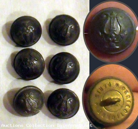 Six Anciens boutons métal perfectionne Paris. Motif "instrument de musique LYRE". Ils sont en métal, a l'avant Gris, au dos doré. Dimension: diamètre 2 cm X hauteur 1 cm. Référence:141224.