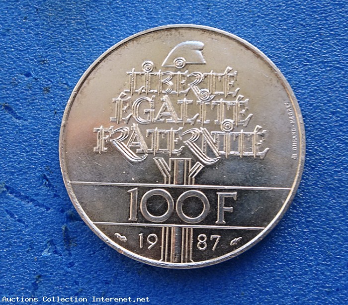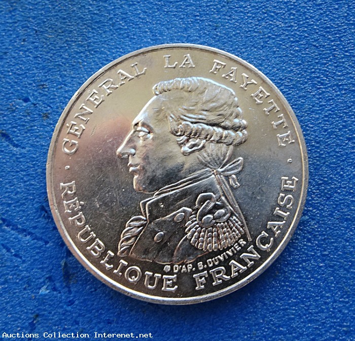 Pièce 100 Francs LIBERTÉ FRATERNITÉ ÉGALITÉ - GÉNÉRAL LAFAYETTE - Graveur : Atelier de Paris - Frappée en 1987 -31 mm - 15 g - Argent (900%)-Tranche lisse - état superbe, pièce non utilisée, non circulé.