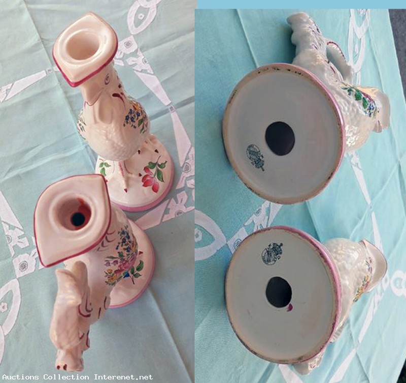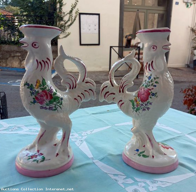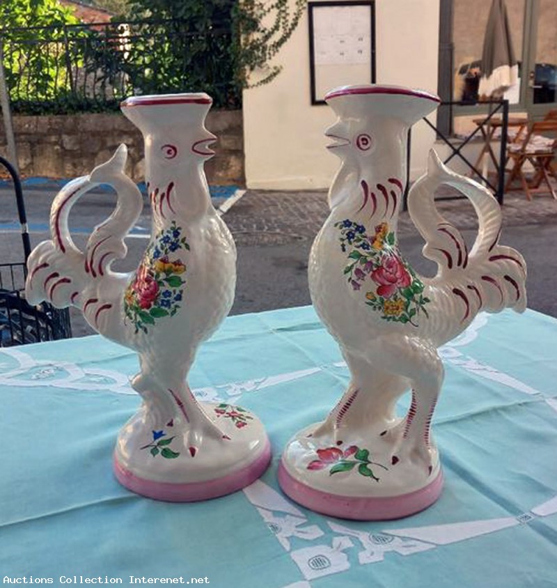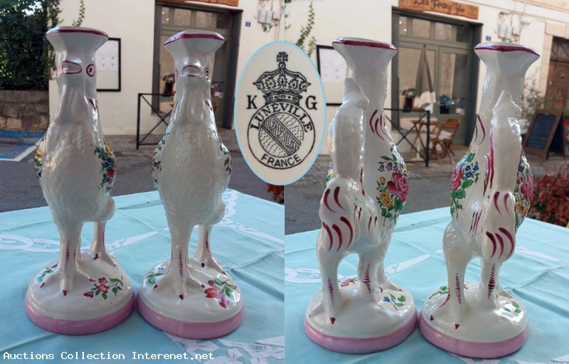 Paire bougeoirs de coqs céramique Lunéville KG, très belle pièce Estampillés sur chaque pièces. Dimensions: Hauteur total: 27 cm. Largeur et longueur haut: 16 X 9 cm. Diamètre socle: 11,5 cm Poids des deux : 1,000 Kg. Les photos fonds parties de la description. Brocante, objet ancien et d'occasion bon état général, Livraison Pick-up. (la poste).
