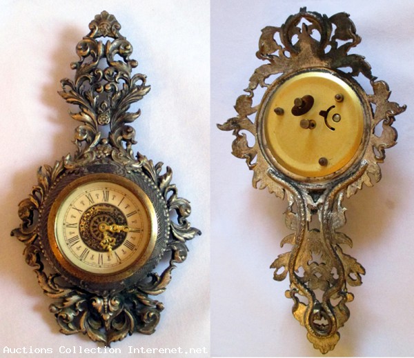 Ancienne et belle pendulette de marque MERCEDES - mouvement bloqué car trop remonté (facile a débloquer pour un spécialiste) - corps bronze métal argenté finement ciselé tout d'origine et patinée - aiguilles dorées - des années 1950/70 - c'est une pendulette murale avec crochet soudé qui est présent - dimensions 21.5 cm de haut x 12.5 cm au plus large, poids 600 gr - superbe qualité ! et belle déco.