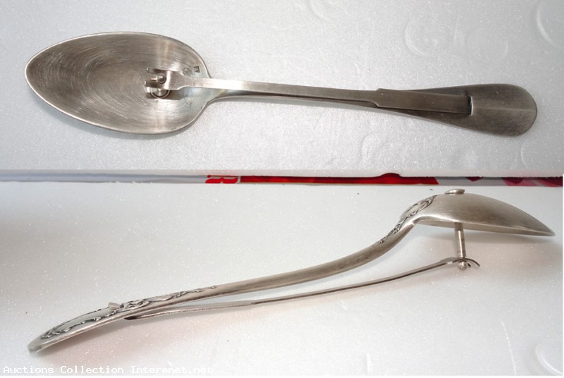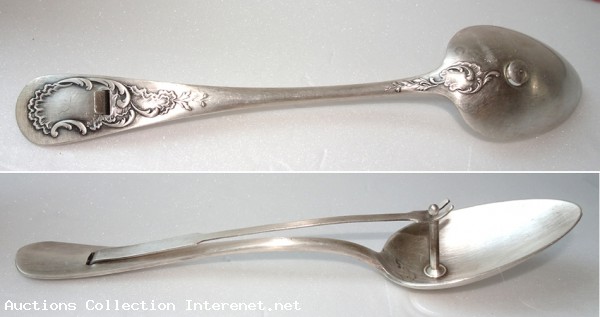 Ancienne et Rare cuillère a système en métal argentée, au motif floral - je n'en connais pas l'utilité ? merci de votre aide, je pense au décor de gâteaux avec un filet de sirop ou chocolat ? estampillé poinçonnée - début siècle, en parfait état de conservation .