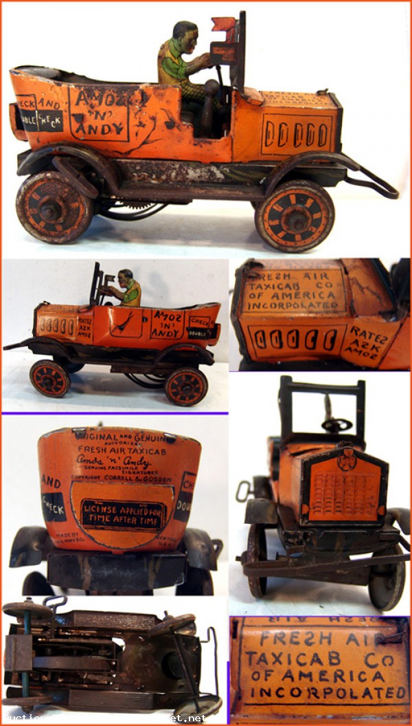 Très rare taco Andy USA Louis Marx & , tôle lithographiée, adorable , dans son jus pièce de musée!! des années 1920. les publicités sont en très bon état vu son âge, manque un personnage a l'arrière de ce taxi fou, moteur complet mais il faudra remettre le ressort qui a lâché mais pas cassé, et a ressouder délicatement une patte du pare choc c'est minime, dimensions 20 cm de long 9 cm de large 13 cm de haut au pare brise. pièce de musée.