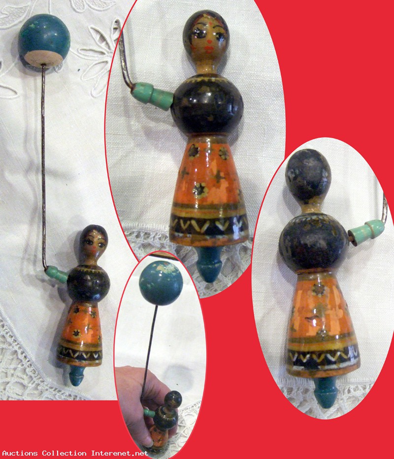 Ancienne pièce de jouet en bois SLAVE?, pour réparation &/ou restauration de manège automate. Peint à la main. Je ne sais pas ce que sais, merci de votre aide! Dimensions: Hauteur total - 25 cm. La poupée mesure 10,5 cm de haut X diamètre 3 cm. Le ballon Diamètre 3,5 cm. Référence; N160617.