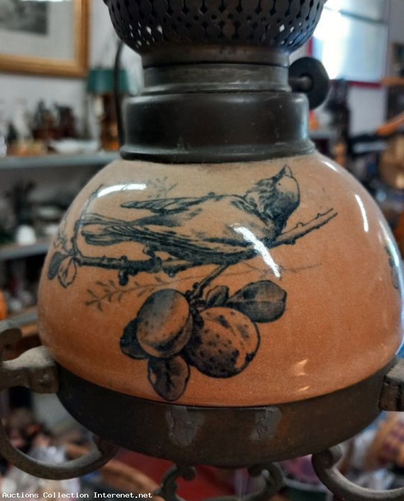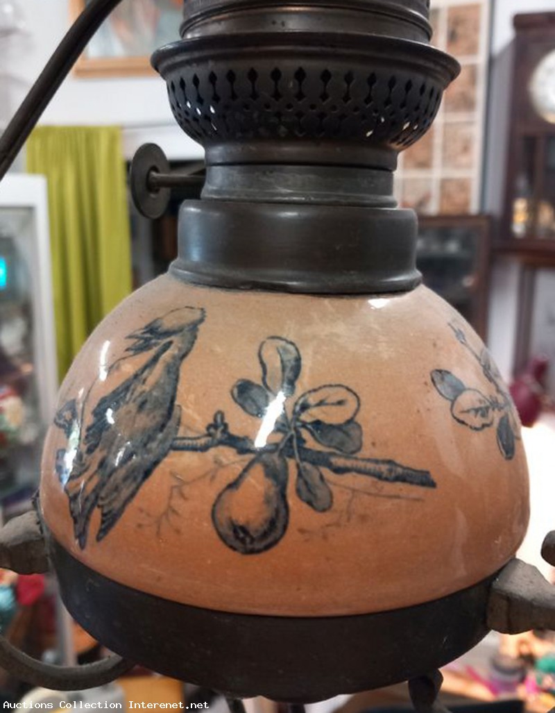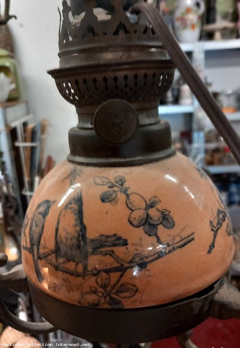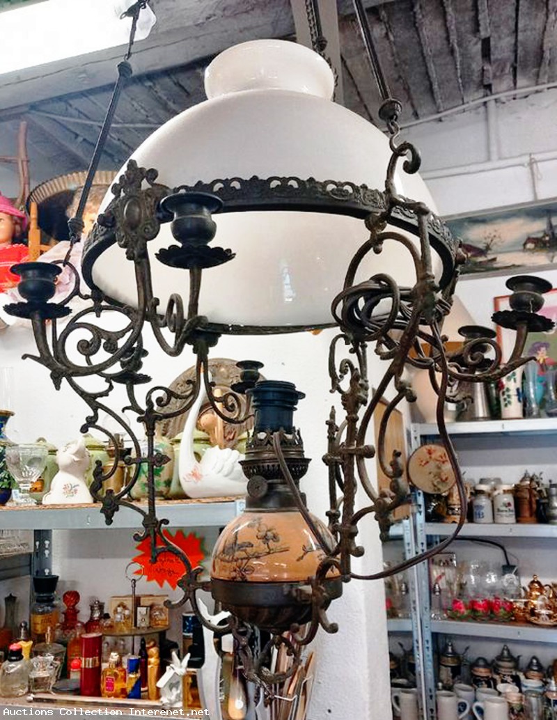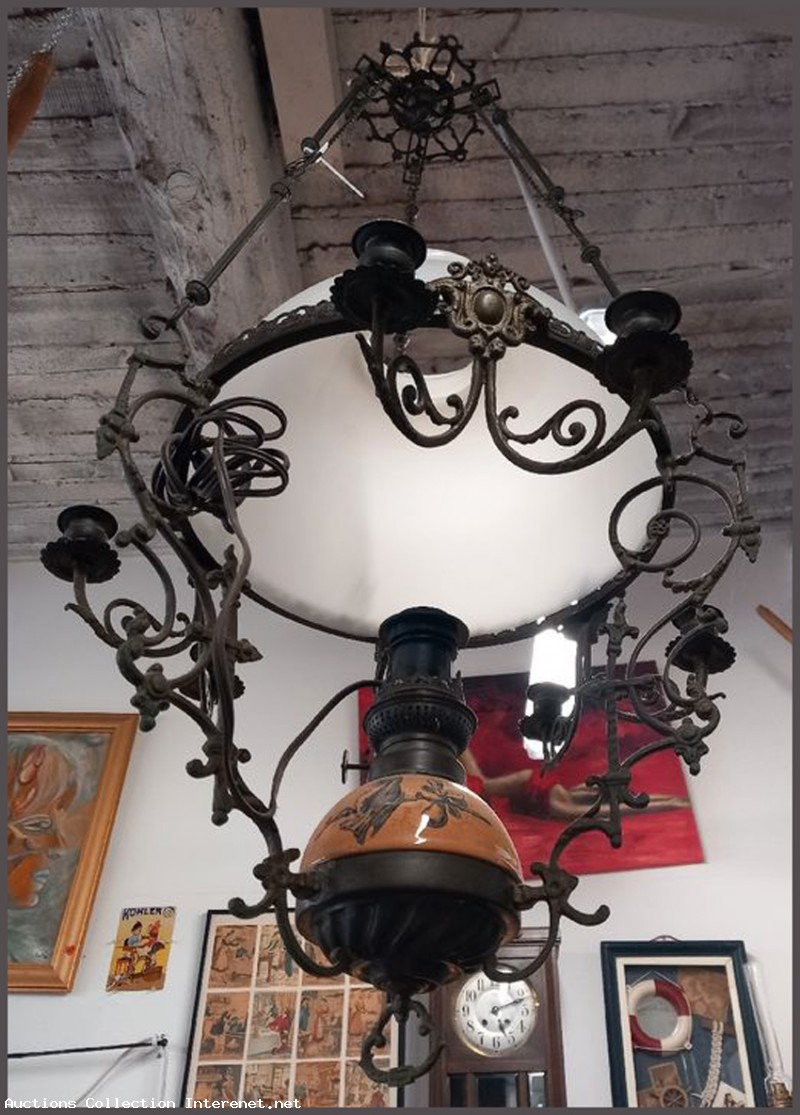 Luminaire: Ancien lustre suspension à pétrole à contrepoids en fer forgé et céramique avec 6 portes bougies. Dimensions: