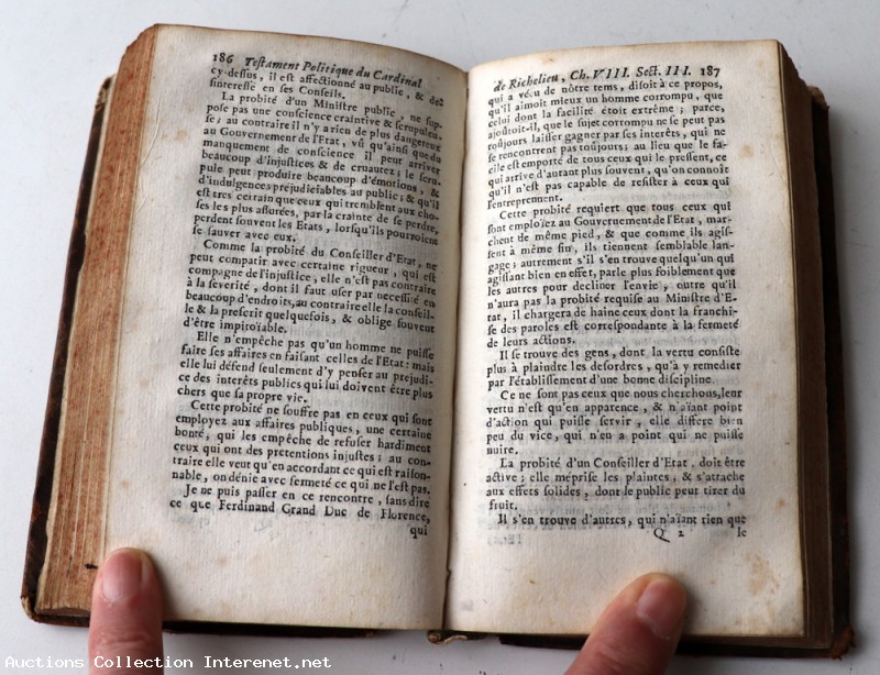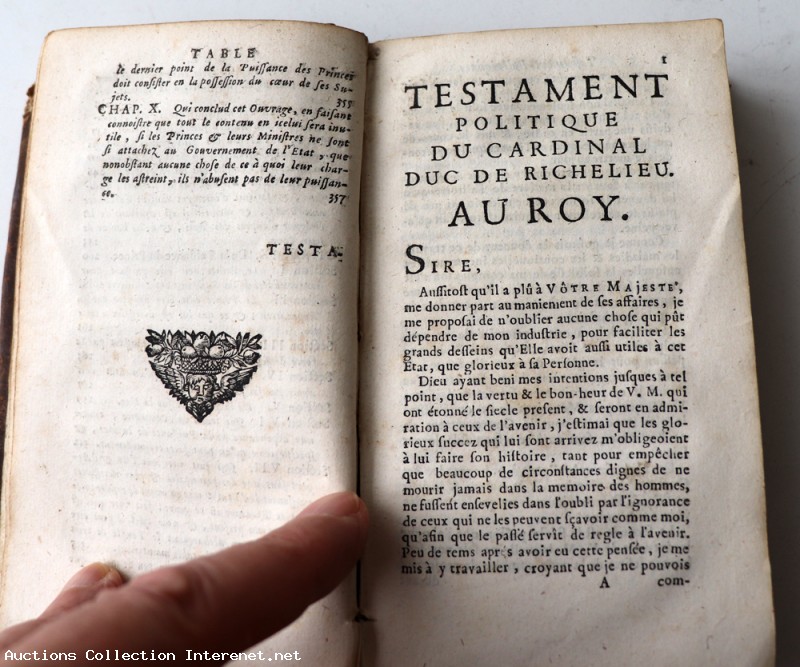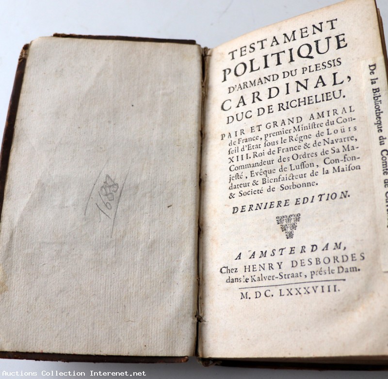 Très ancien livre le Testament politique d'Armand du Plessis, cardinal duc de Richelieu au Roi Louis XIII roi de France & de Navarre - Dernière édition, livre en 2 parties - Ce Testament apporte des renseignements d'une grande précision sur l'administration française sous Louis XIII, qu'il s'agisse du commerce, de la guerre ou de la justice. 360 pages en superbe état sans trace d'humidité ! - le dos a 5 nervures est un peu abimé en bas voir photos rien de méchant vu son grand âge - année 1688 !!. Imprimé a Amsterdam chez Henry Desbordes - Écris en vieux français - dimensions 15.5 cm x 9.5 cm - livre rare et pièce de musée.