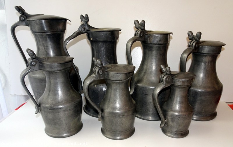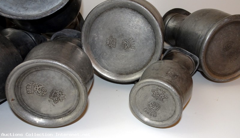 Très Anciennes mesures, 18eme - lot complet de 7 pièces de la plus petite 16 cm a la plus grande 26 cm au poucier, en étain massif - se sont d’anciennes mesures de liquide, vin, bière etc.. - couvercle aux glands, en très bon état de conservation, vu leurs âge - poids 7.5 kilos - série d'origine non nettoyée - double estampille, poinçon le Château et autre a définir une couronne ? Voir photo - étain à 82 % - rare et belle déco.
