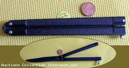 Beau couteau pliant papillon en métal, de couleur noir.Ancien, Vendu dans son jus.pour toutes question me contacter, merci.Dimension: longueur fermé 13,5 cm X largeur 2,8 cm Longueur total ouvert 24,5 cm.
