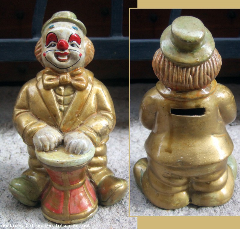 Ancienne tirelire clown musicien, en céramique *** 19 cm