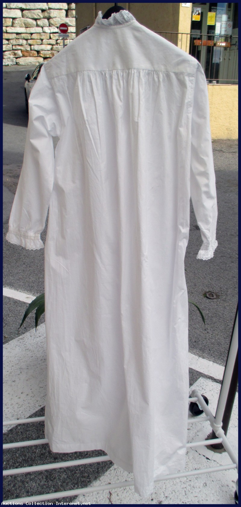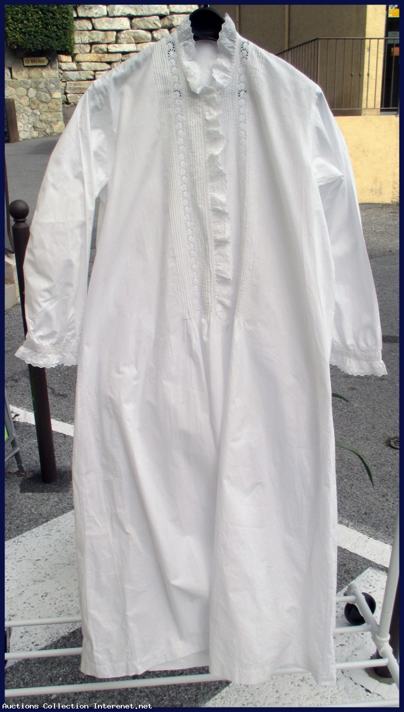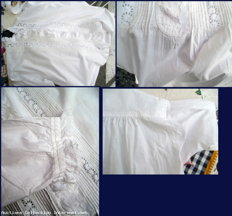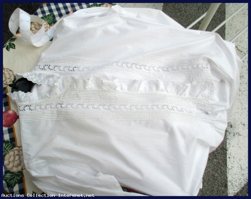 Ancienne et Authentique chemise de nuit femme style Victorien. En fils de coton blanc (popeline?) plis bonnes sœurs et dentelle