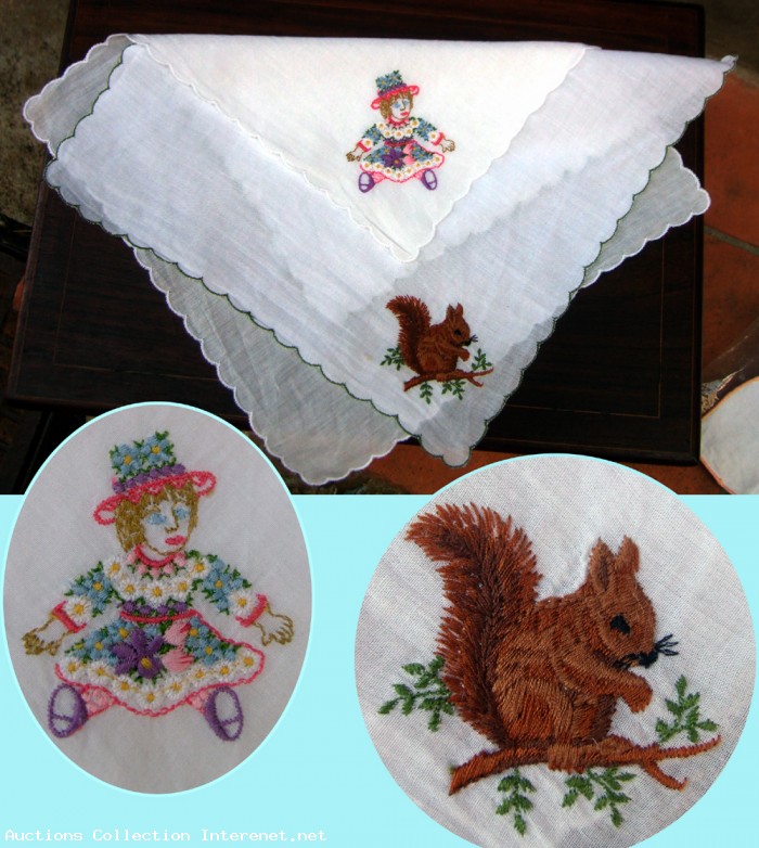 Quatre Anciens mouchoirs, Brodé main. Motif Petite fille & Écureuil.